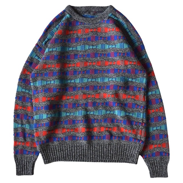 カラフルな立体ニット 素材表記などはありませんが、ウールにアクリルが混ざったような、柔らかく暖かさもありながら、フワッと軽い触り心地の生地 グレーに見えるブラックとホワイトの混交の生地に、レッド・ブルー・グリーンと彩度の高いカラーがクネクネとしたボーダー状に施されています COOGIなどの立体系のニットと比べると、表面の立体感は控えめですが、カラーリングも激しすぎず、スタイリングしやすいアイテムとなっています サイズ表記もありませんが、L〜XL位のゆったりとしたサイズ感 スタイリングの主役として、その他をシンプルにまとめてもバランスが取れる1点 コンディション B+ 身幅 62cm 肩幅 63cm 袖丈 63.5cm 着丈 70cm 表記サイズ 表記なし(L〜XL位) 素材 表記なし(ウール、アクリル系) ※こちらのアイテムはUSED商品となります。 ※手作業での採寸の為、1〜2cm程の採寸のずれが生じることもございますのでご了承下さい。 ※商品は全て平置きにて採寸したものです。 ※USED商品のため、多少の匂いなどがある場合があります。神経質な方はお控えください。 ※ダメージや汚れ、ほつれなどのある場合は、出来る限り記載するよう勉めさせて頂きますが、 全て正確に記載することは困難なため、あくまでもUSED商品であることをご理解の上お求めください。 ※実際の商品とモニター上の画像で、色合いや素材感が若干異なる場合があります。 ※こちらの価格には消費税が含まれています。 ※送料は別途発生いたします。 ※10,000円以上のご注文で送料が無料になります。
