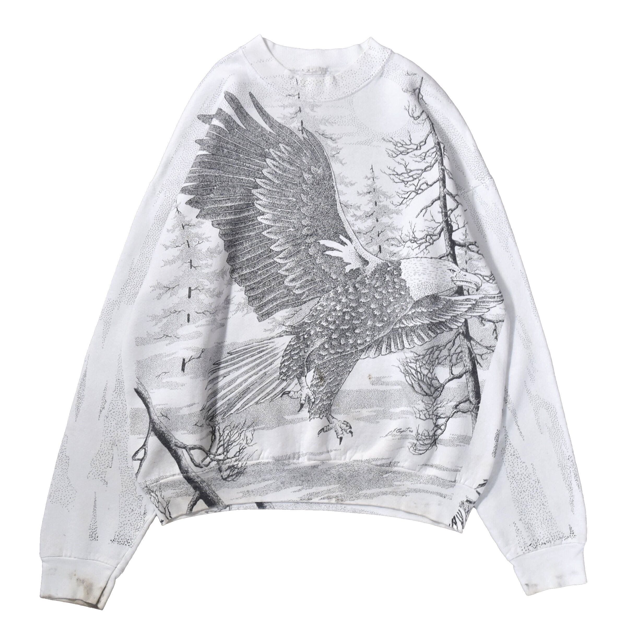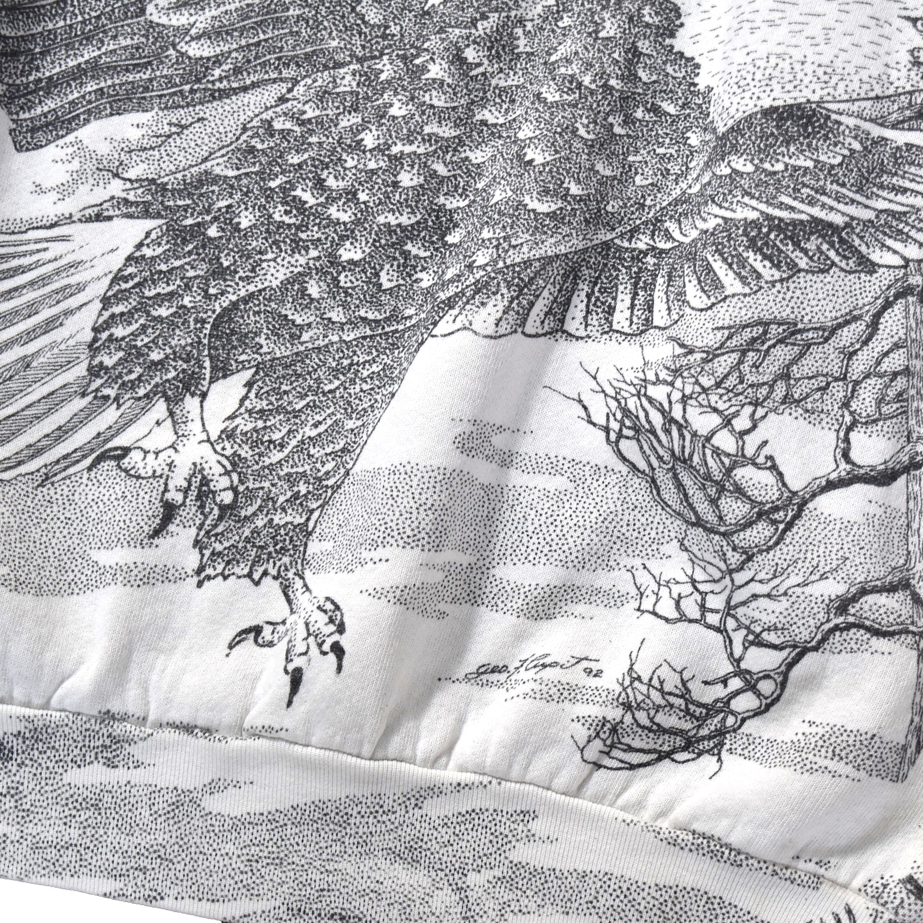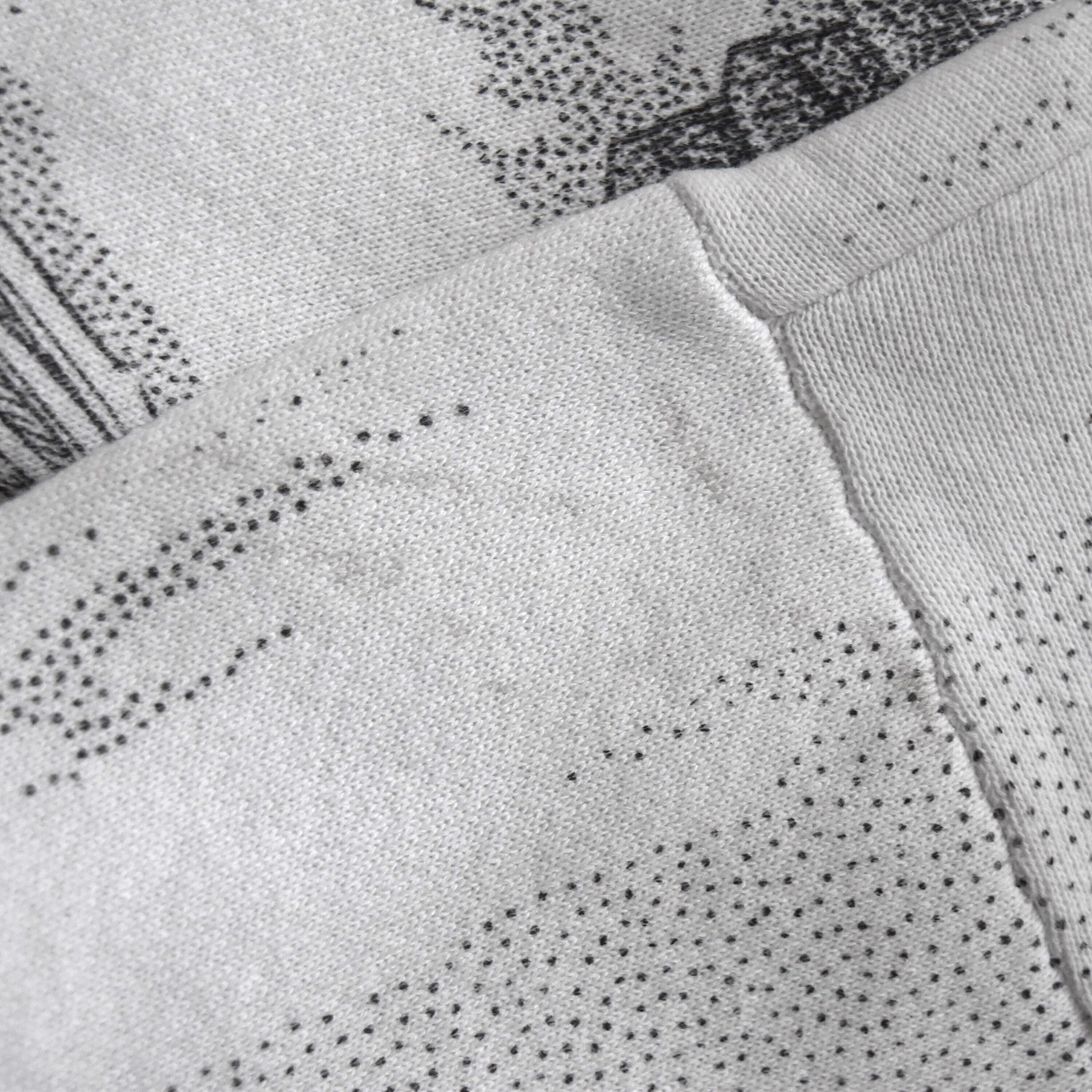 前後同じプリントが首元のリブにまでプリントされている大胆なデザインで、存在感がありながらもモノトーンなのでうるさすぎない、バランス感の良いアイテム