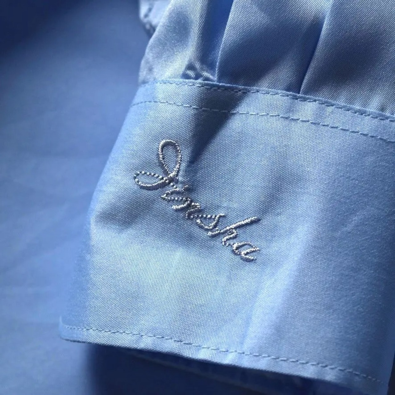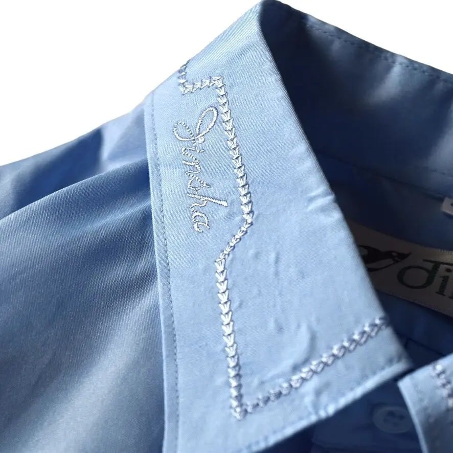 一見シンプルですが、襟や胸ポケット、右袖口に同系色で光沢のある刺繍が施されており、主張しすぎず遊び心もあるアイテム