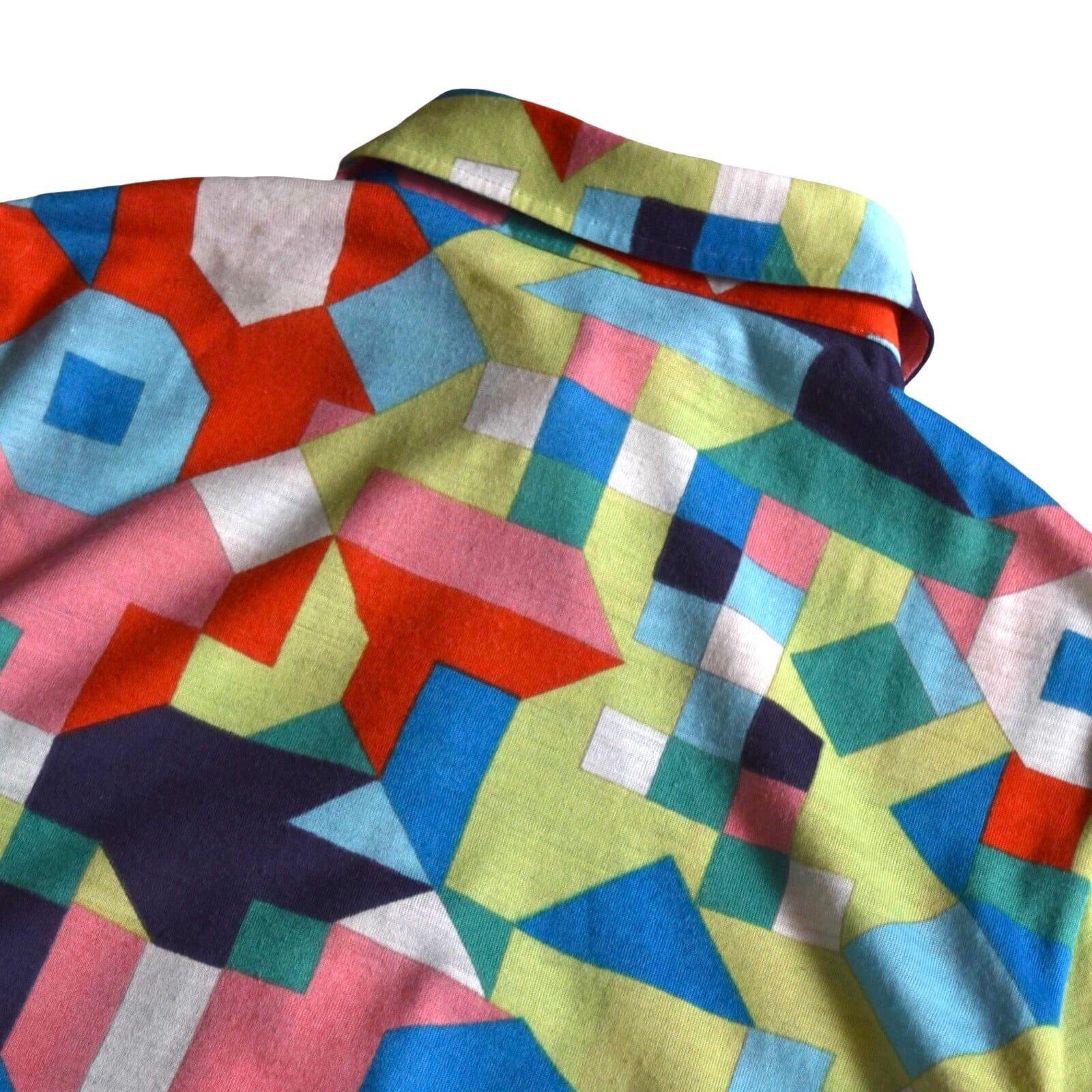 長く伸びた可愛い襟と、カラフルで幾何学的な総柄が特徴的