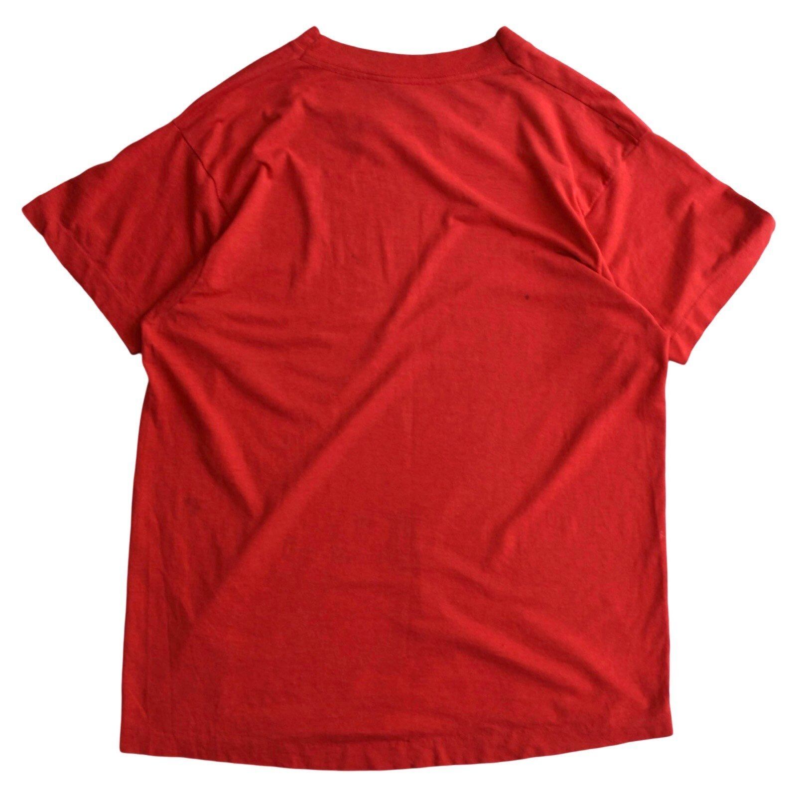70年代あたりのプリントTで、素材表記は読み取れませんが、柔らかく伸縮性のある標準的な厚さのポリコットン系の生地