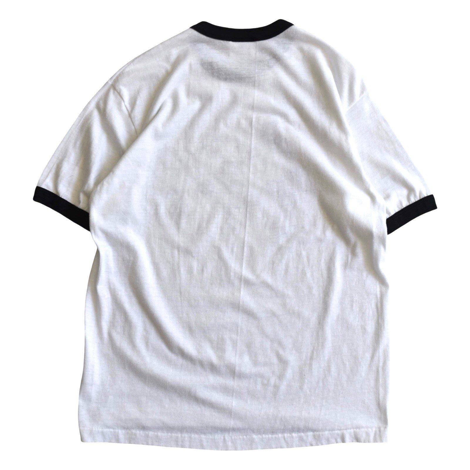 ホワイトボディにブラックの首・袖リブがついたモノトーンなリンガーネックで、プリントまでブラック