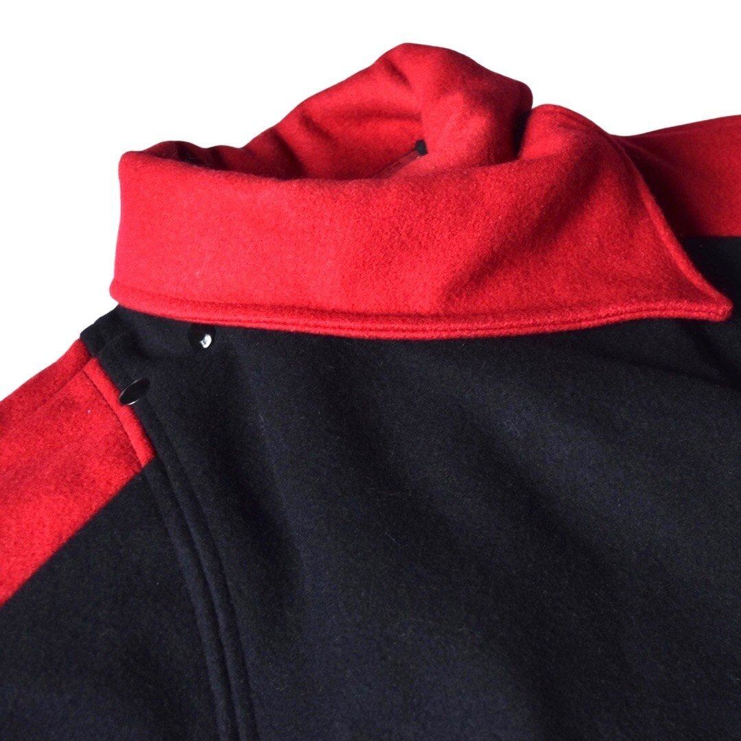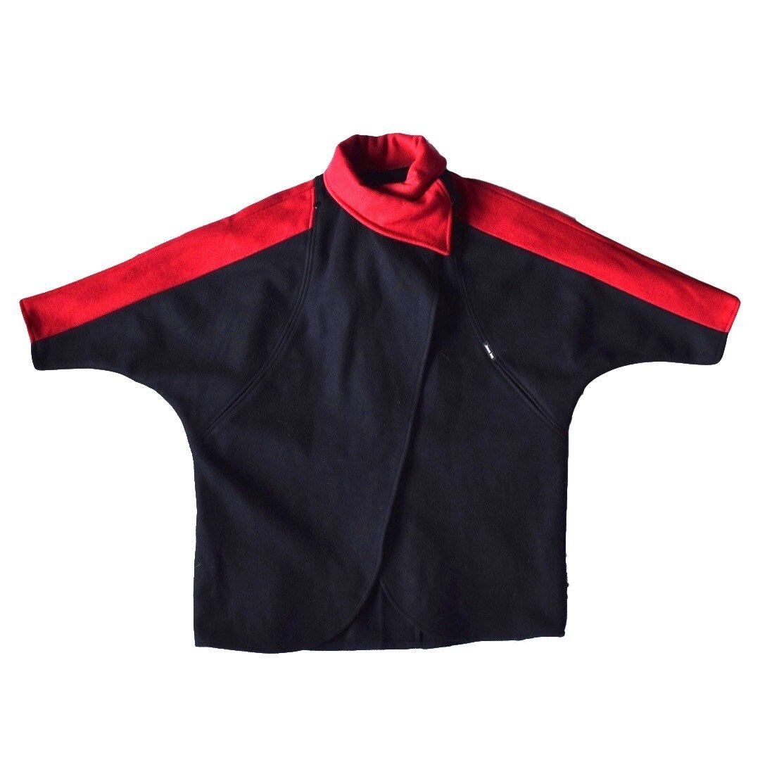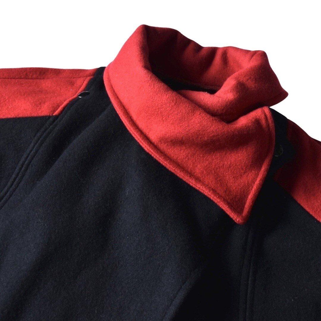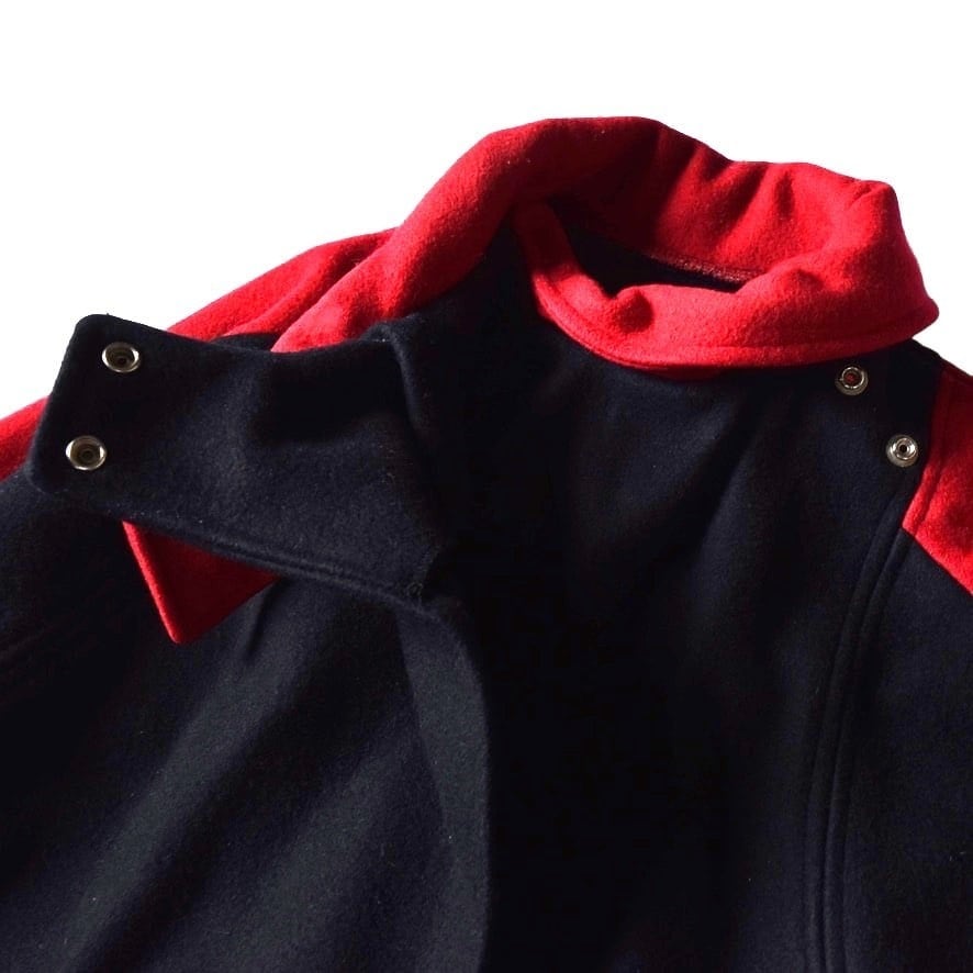 長めの襟を重ねるように、内側と外側でスナップボタン留めし、アシンメトリーなデザインに仕上がります