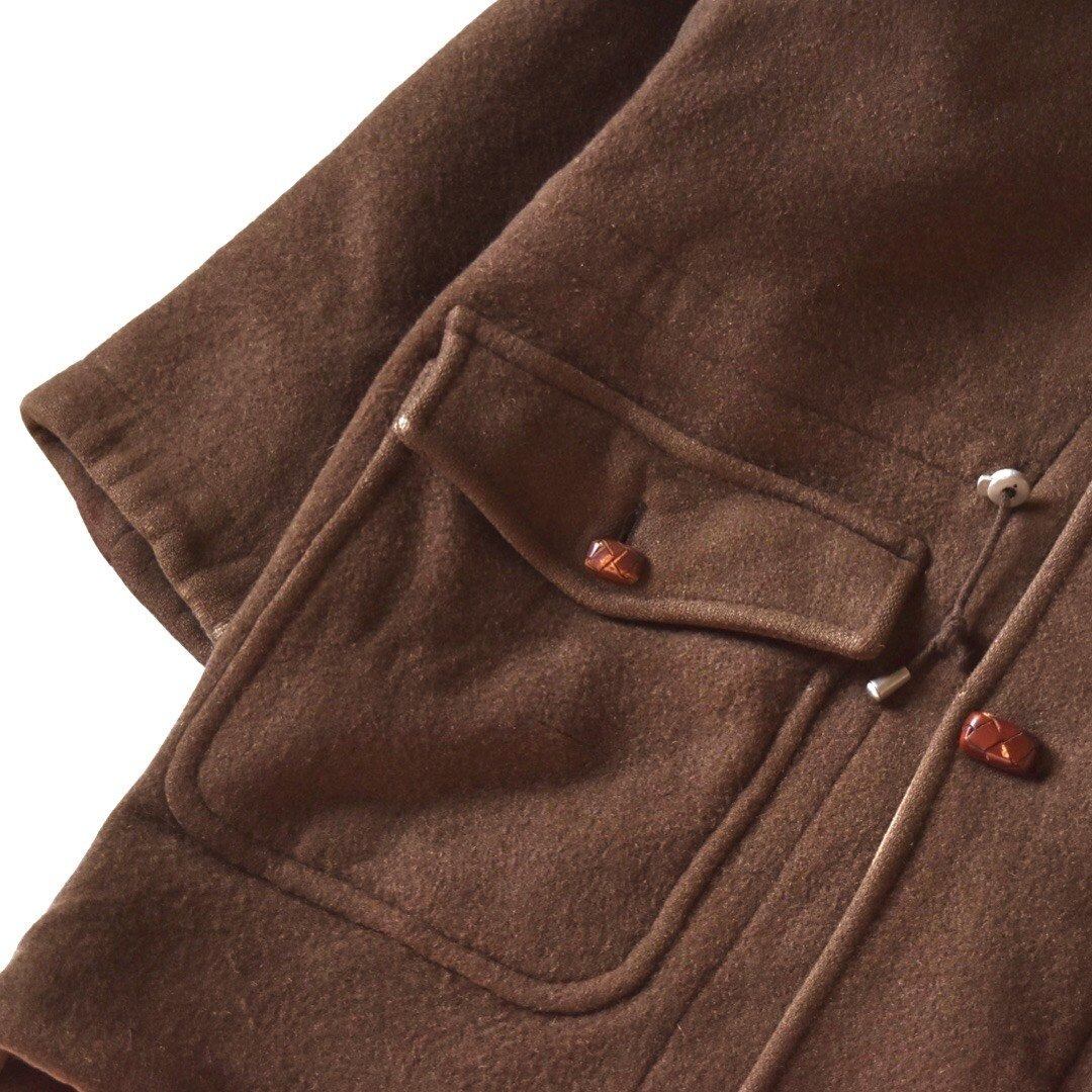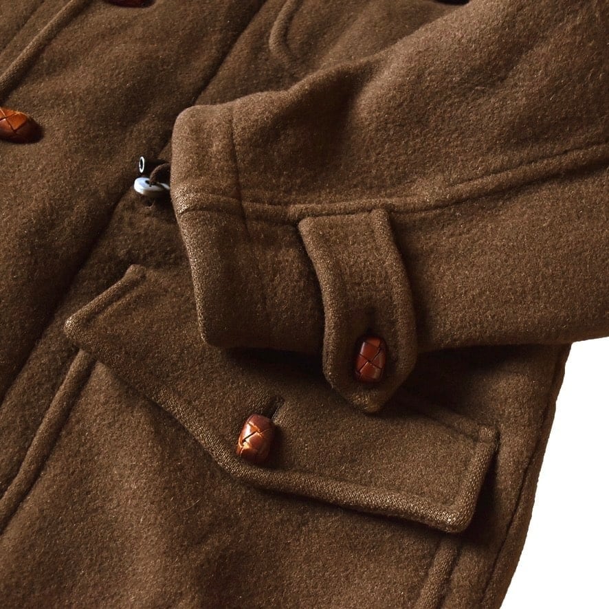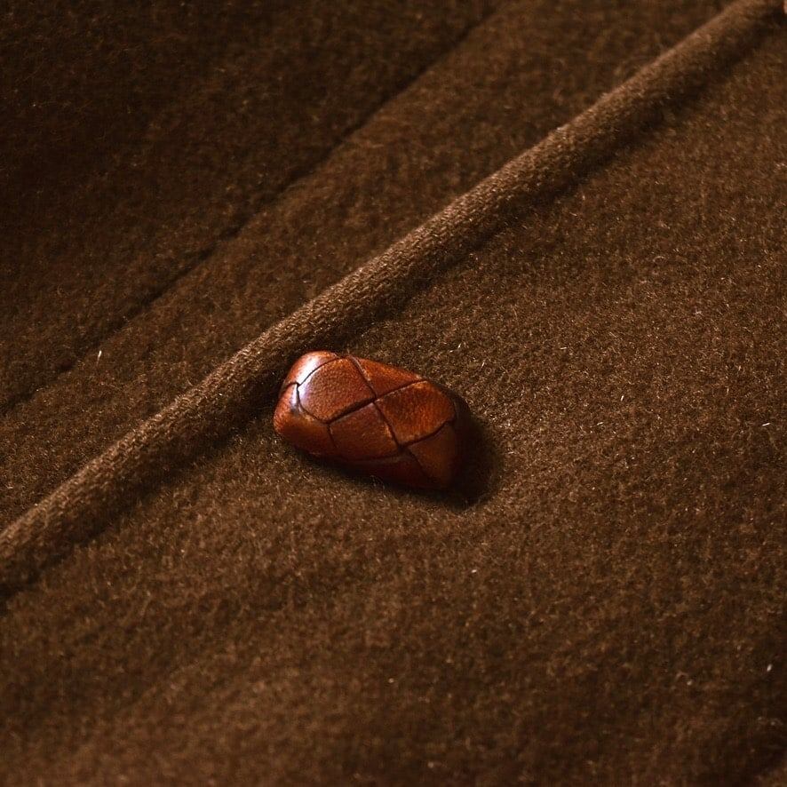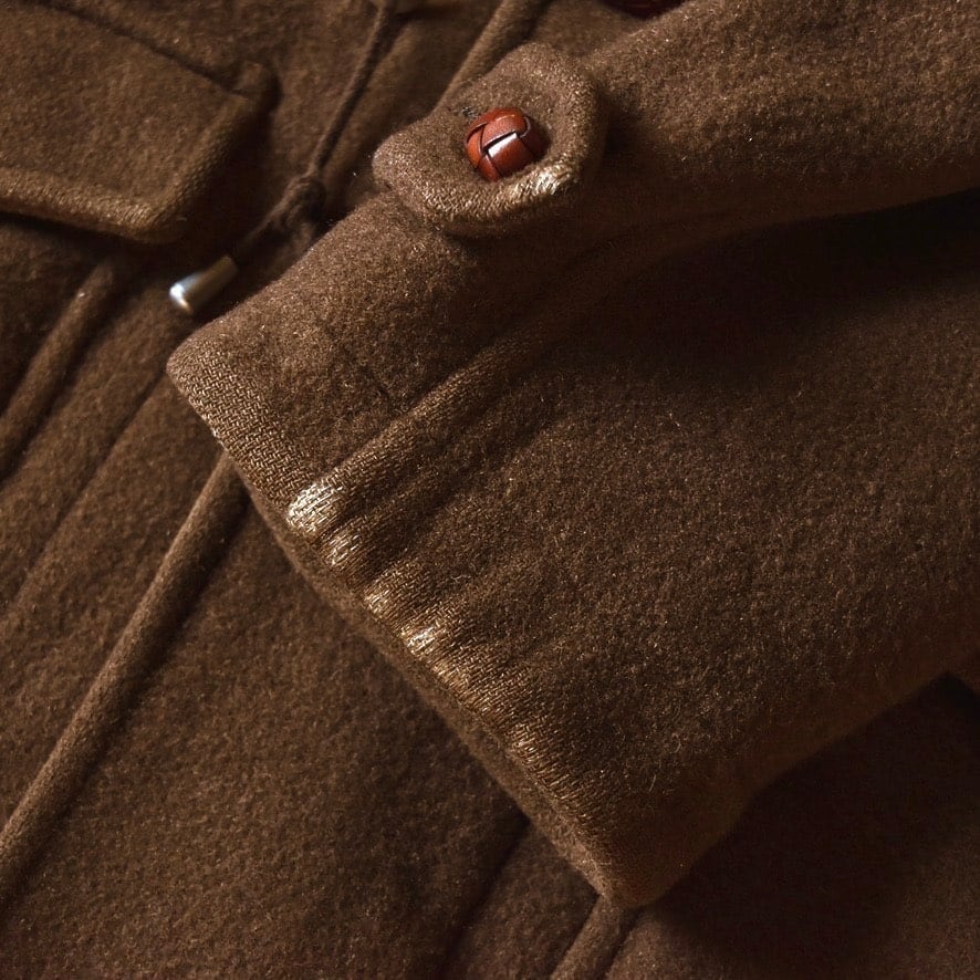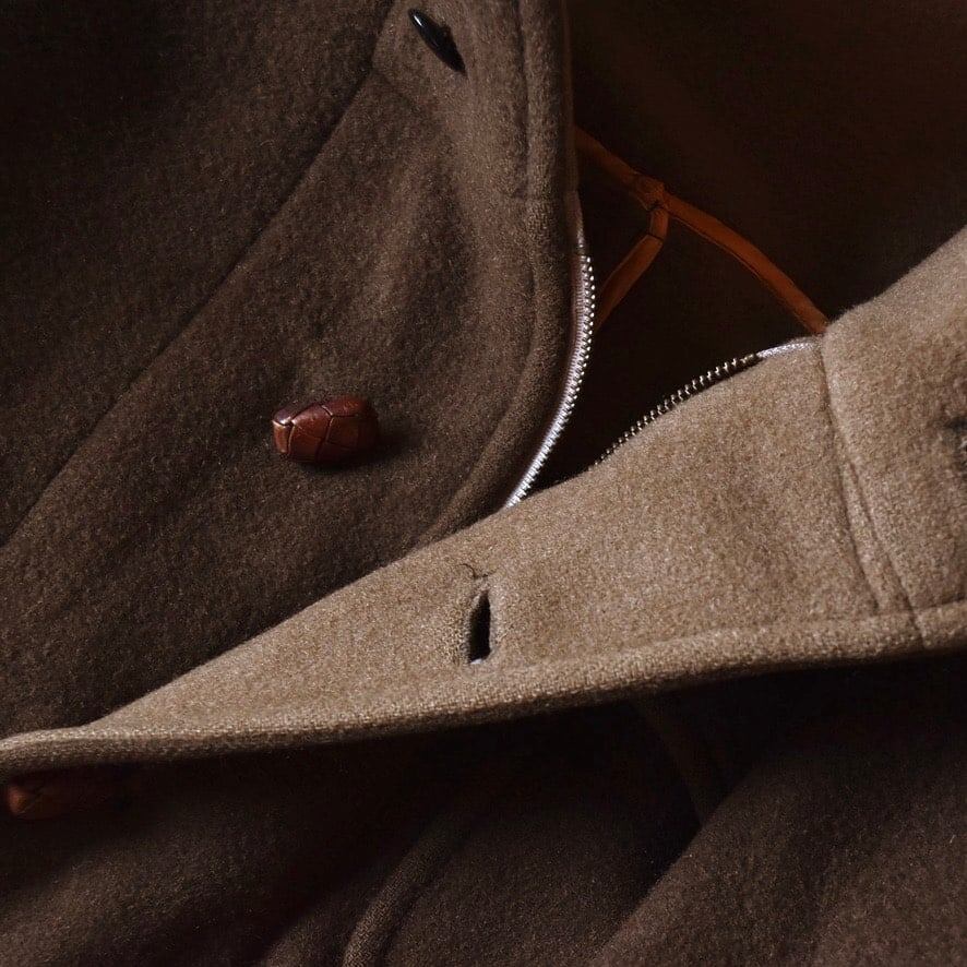 一般的なダッフルとは異なりフロントはジップ&ボタン留めで、トグルボタンよりも防風力のあるディティールです