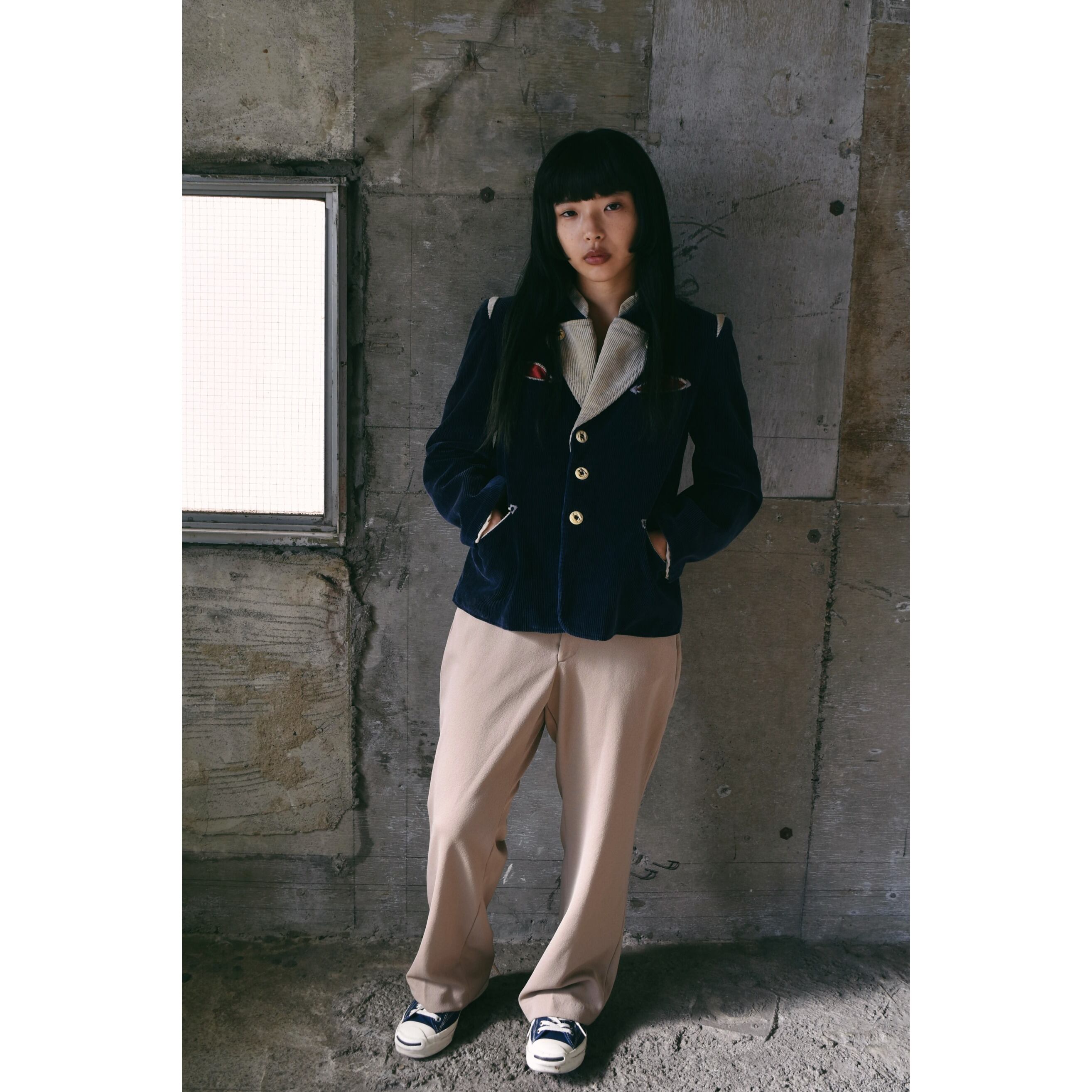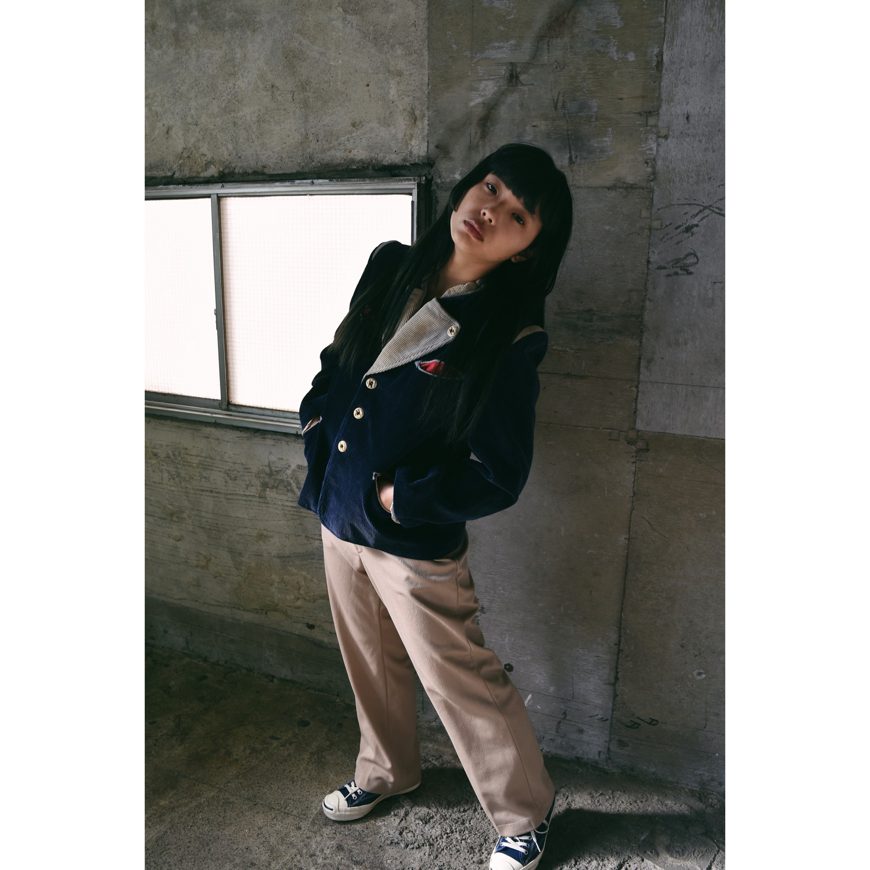 襟はほぼノーカラー状態の開放的なディティールで、ボタンで固定されたラペルだけついています