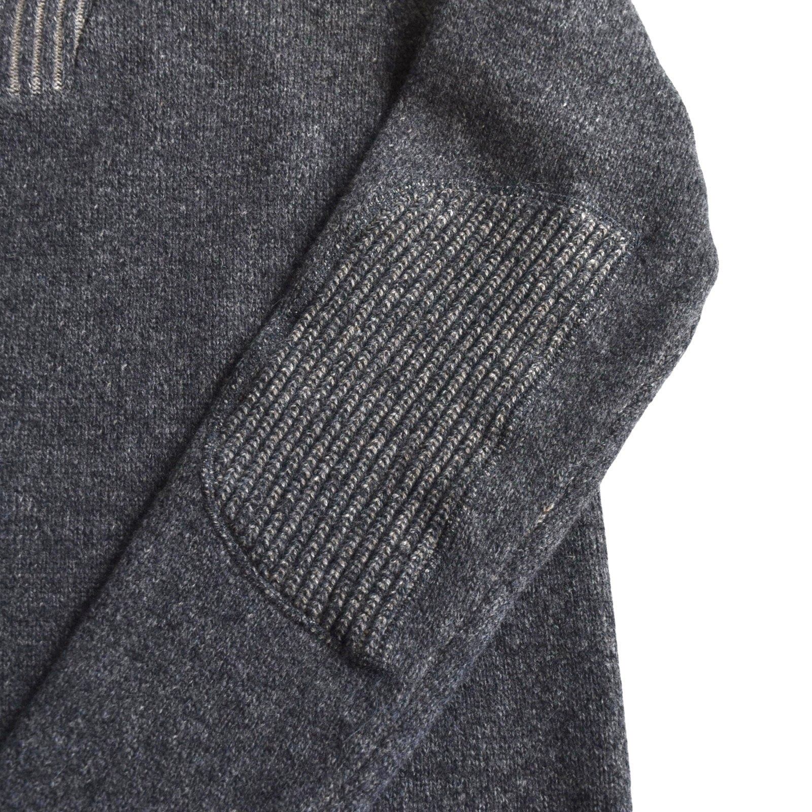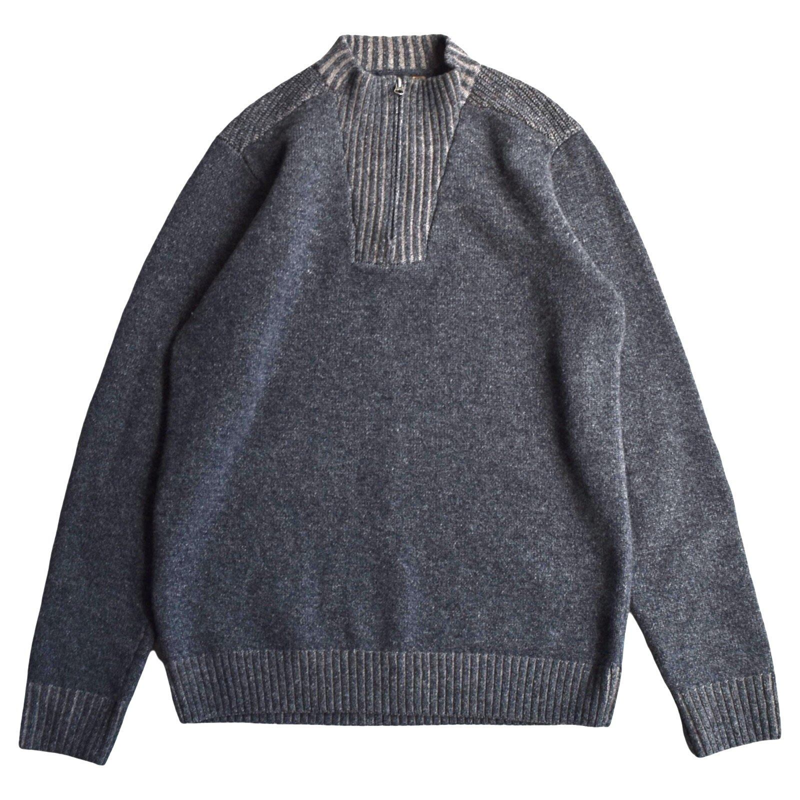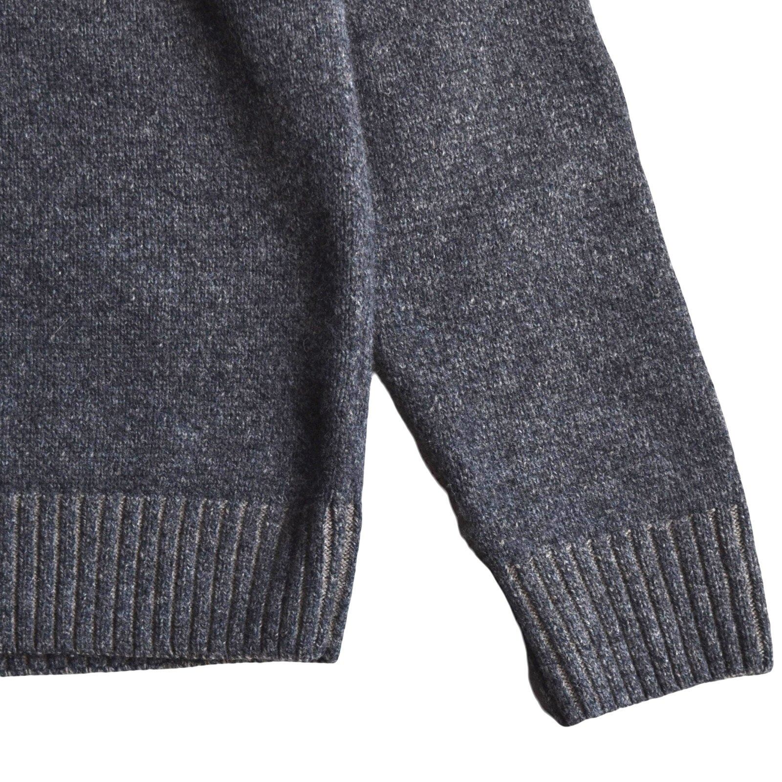 厚手のニット生地は、淡いネイビーとくすんだベージュ系のカラーの繊維によって、落ち着きがあるニュアンスがあります